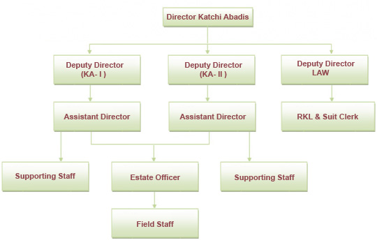 In Punjab a full-fledged Directorate General of Katchi Abadis & Urban Improvement is working under the Local Government and Rural Development Department Government of the Punjab. All policy matters are being looked after by the Directorate General in liasion with the Katchi Abadis Cell of Ministry of Environment, Local Government & Community Development and Government of Punjab. At the lower levels the Development Authorities are performing the functions of Executing Agencies and are responsible for implementing the Katchi Abadis Regularization/Development Programme in big cities like Lahore, Faisalabad, Multan, Rawalpindi, etc. As such the Lahore Development Authority is working as Executing Agency on behalf of Directorate General Katchi Abadis & Urban Improvement, Punjab, for implementing the policy decisions of the Provincial Government.Policies
