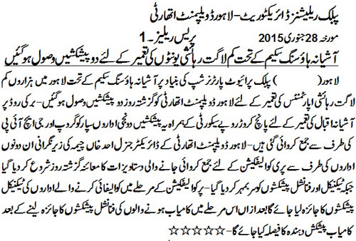 Two bids received for construction of affordable houses under Ashiyana Scheme.