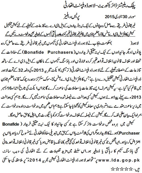 LDA has established a commission and commission office in QAT to resolve the issues of Bonafide Purchasers, who have purchased plots through illegal procedure.