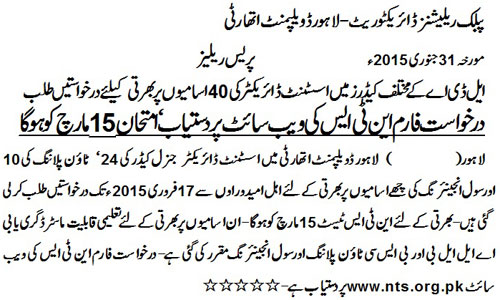LDA will recruit 40 new Assistant Directors. Application form and Bank Challan can be downloaded from NTS web site (www.nts.org.pk).