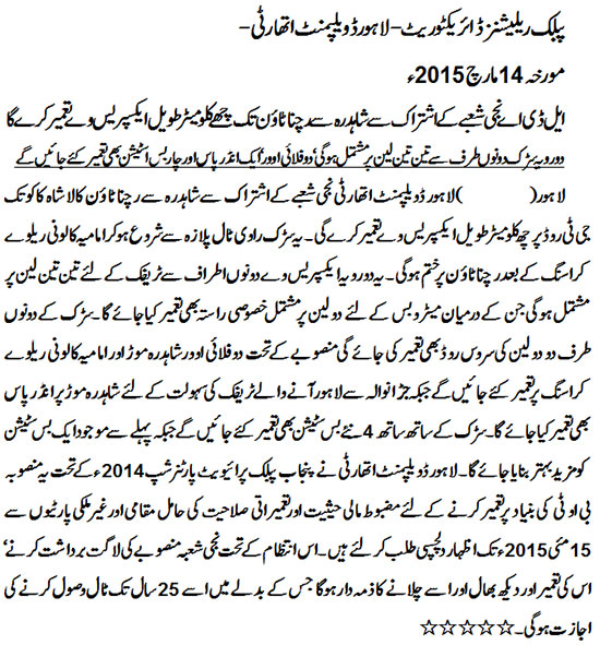 LDA will construct 5.8 km long Expressway on G.T. Road from Shahdra to Rachna Town.