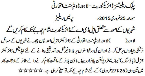 Office timings extended for Three days for Public dealing Directorates of LDA