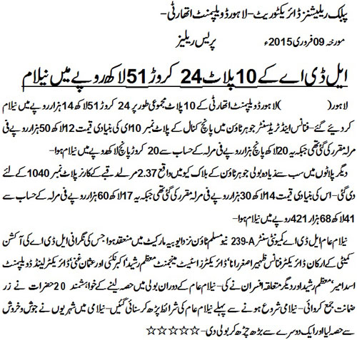 10 plots were auctioned by LDA against a sum of Rs.245 million.
