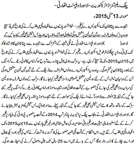 LDA has extended date for submission of bids for construction of 5.8 km long Expressway on G.T. Road up to 15 June 2015.