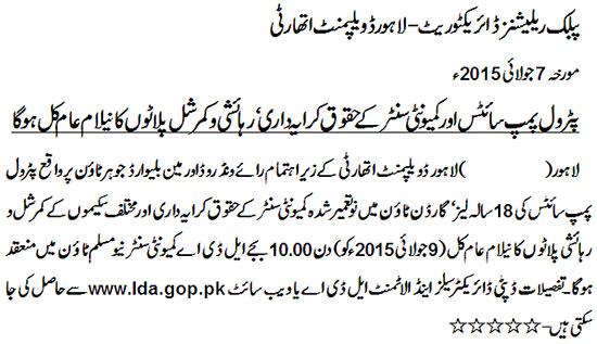 Auction of residential and commercial plots will held in LDA community center at 09 July, 2015