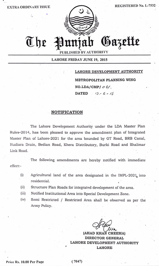 Amendment Plan of Integrated Master Plan of Lahore-2021