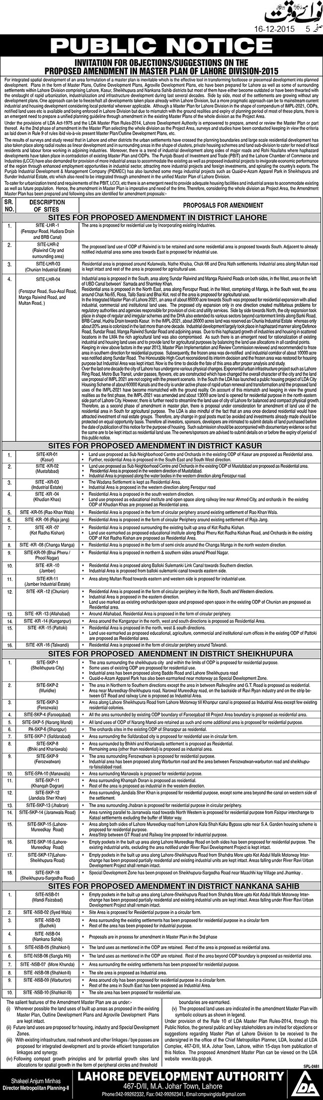 Invitation of Objections/Suggestions on the Proposed Amendment in Master Plan of Lahore Division-2015
