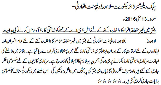 For restraining entry of outsiders into the office of LDA, All the officers/officials of LDA have been directed to display their identity/service Card