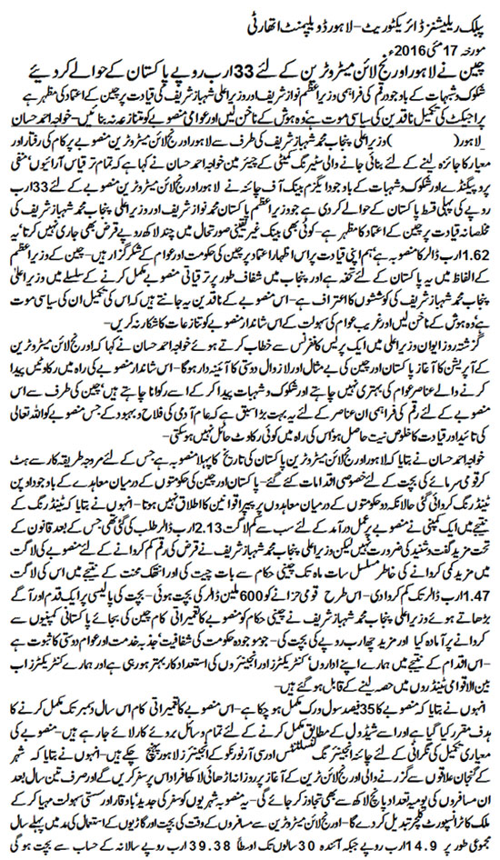 China has released the first tranche of US $ 331.08 million (PKR 33 billion) for the under-construction Lahore Orange Line Metro Train Project.
