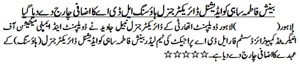 Benish Fatima Sahi has entrusted additional charge of ADG(H)