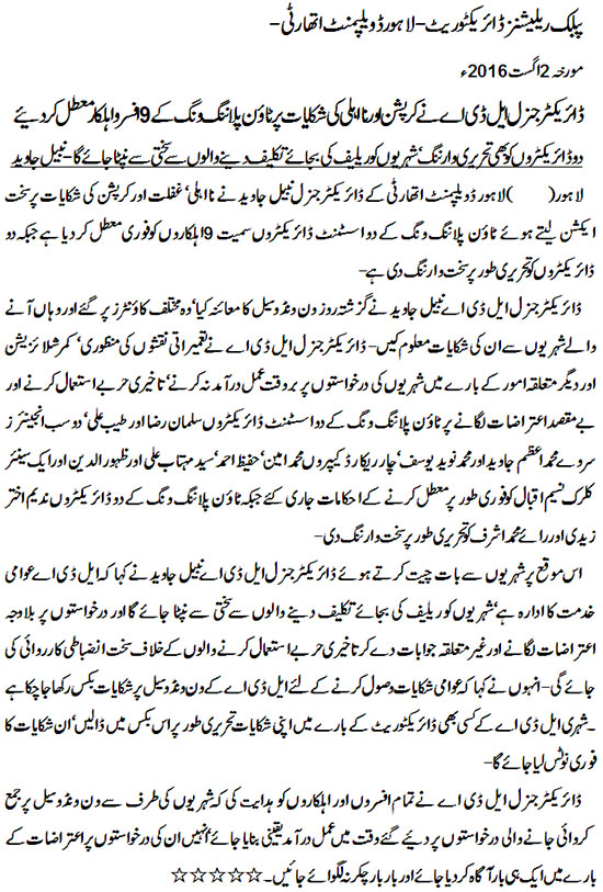 DG LDA has ordered for suspending nine officers and officials of Town Planning Wing.