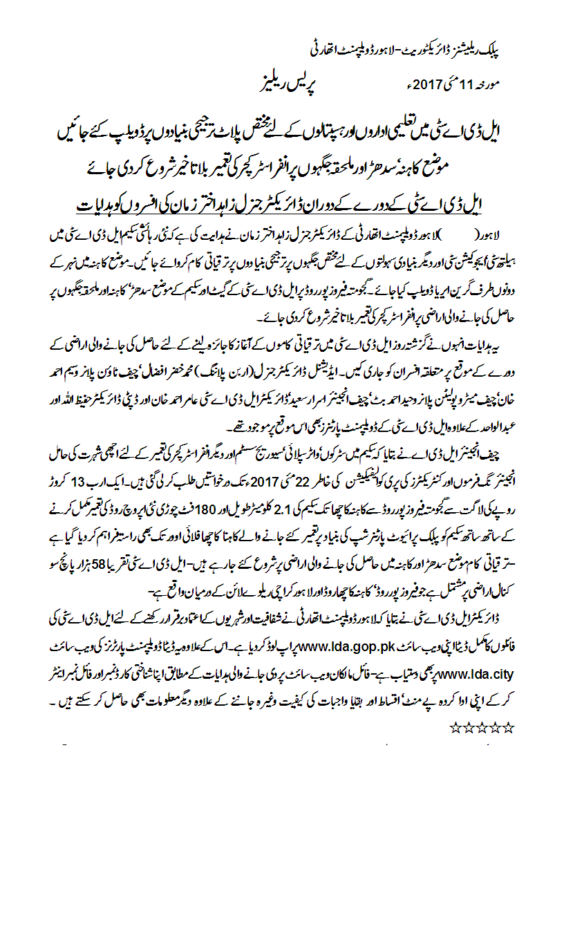 DG, LDA Zahid Akhtar Zaman has directed for developing sites reserved for health, education and other public amenities in LDA City