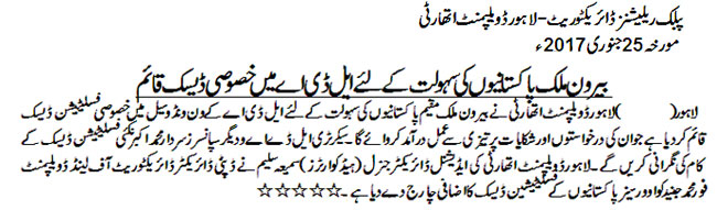 LDA has established a dedicated desk at its One Window Cell, to facilitate Overseas Pakistanis