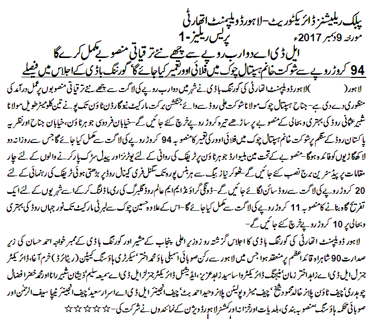 Governing Body of the Lahore Development Authority has accorded administrative approval for executing six new development projects in the city at a cost of Rs. more than two billion.