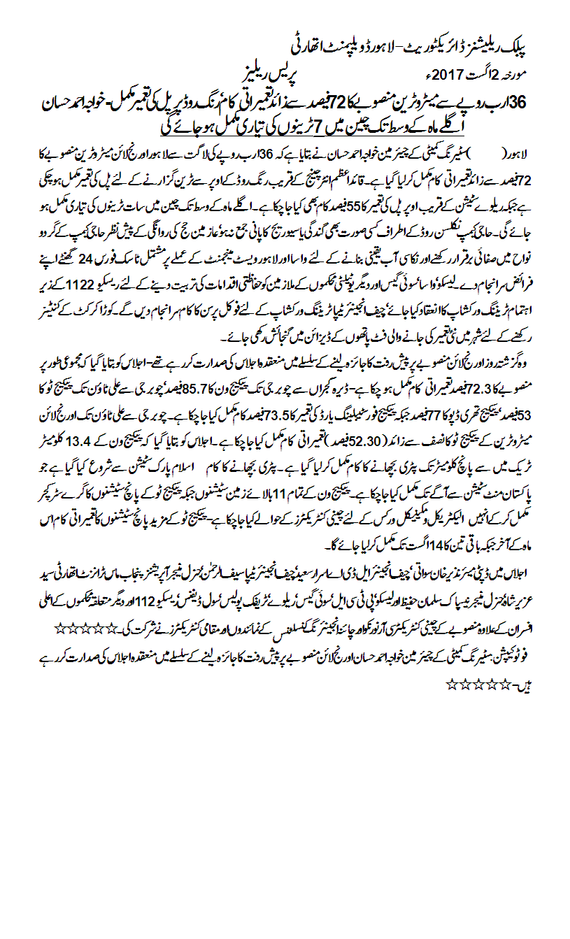 More than 72 per cent civil work on Lahore Orange Line Metro Train Project (LOMTP) has so far been completed