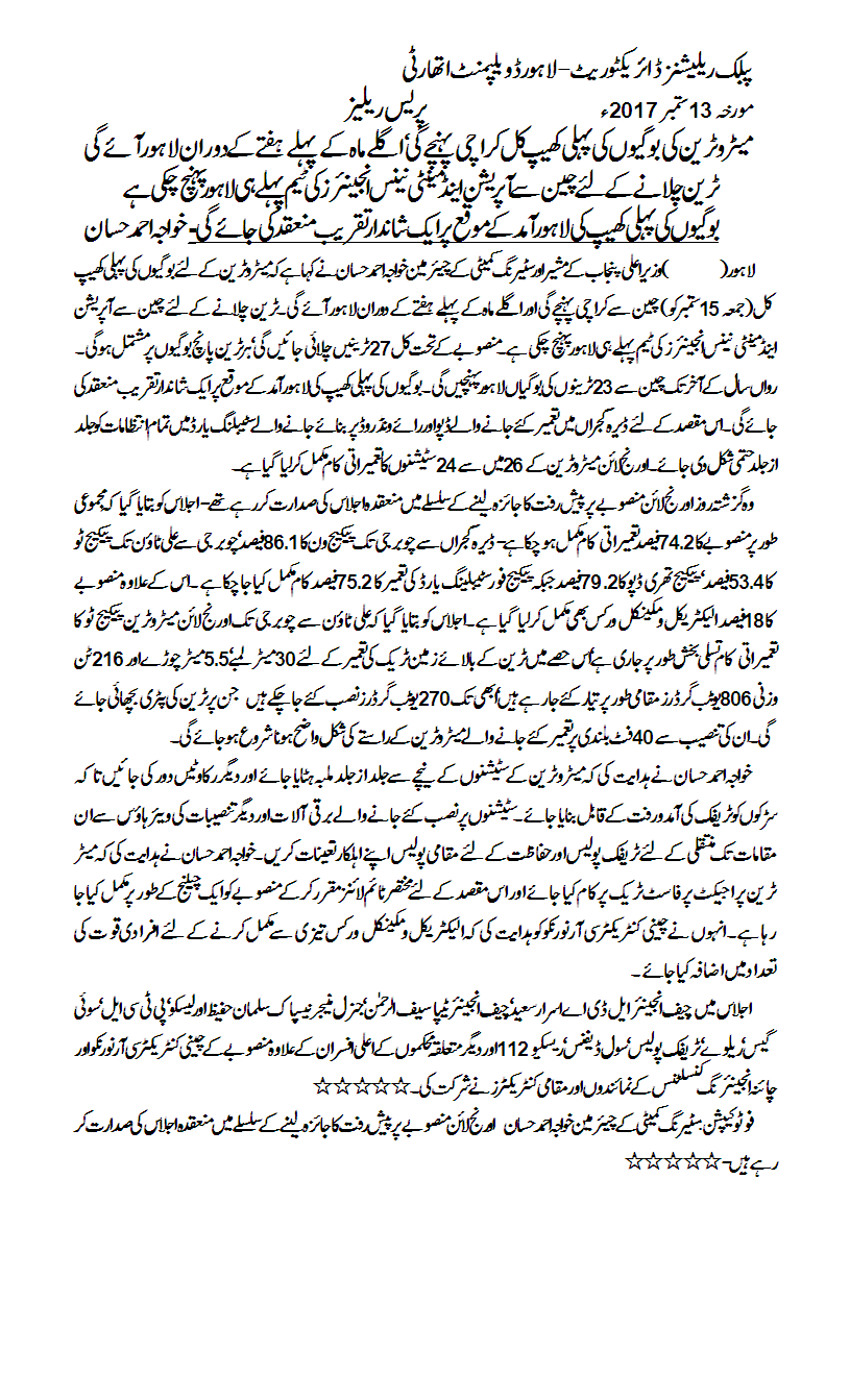First shipment of rolling stock for Lahore Orange Line Metro Train will arrive Karachi tomorrow