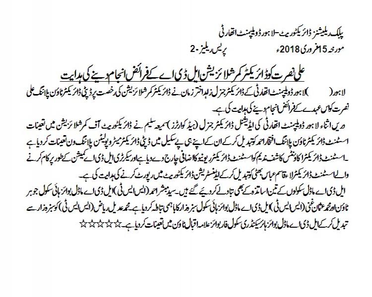 Director General LDA directed Deputy Director Ali Nusrat to take responsibilties of Director commercialization