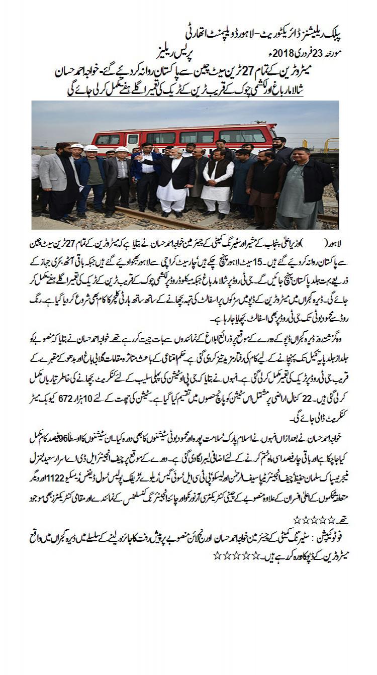 All the 27 train sets for Lahore Orange Line had been dispatched to Pakistan from China