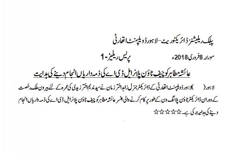 Aisha instructs to take responsibilities of Chief Town Planner LDA