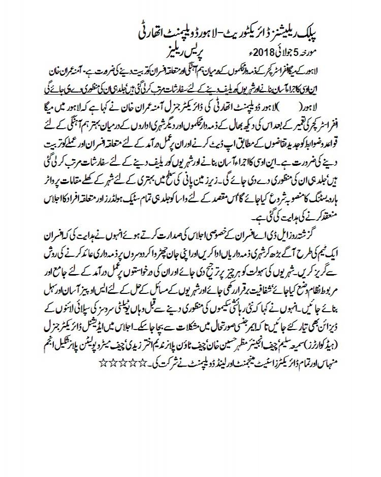 Director General LDA Ms. Amna Imran Khan has underlined the need for better coordination.