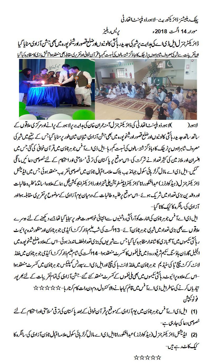 On the initiative of Director General LDA Amna Imran Khan, Independence Day celebrations were also held