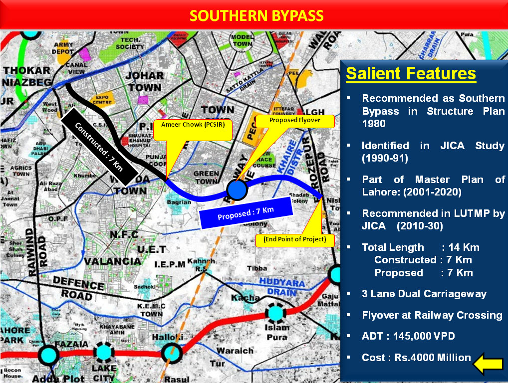 Project for connecting two important inter-city roads, Ferozepur Road and Multan Road, by covering Cantt Drain and constructing a two kilo-meters long three-lane dual carriage way from LOS stop Ferozepur Road to Multan Road was also completed at a cost of Rs. 4.35 billion. More than 70 thousand vehicles are being benefitted daily through this corridor.